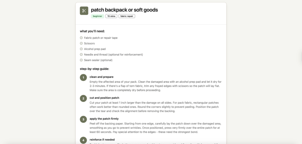 outdoor gear carries stories — the miles you walked, the trips you took, the memories you made. but when a tear or rip happens, the repair process feels overwhelming. tools, materials, techniques… it’s enough to make most people give up and buy new.