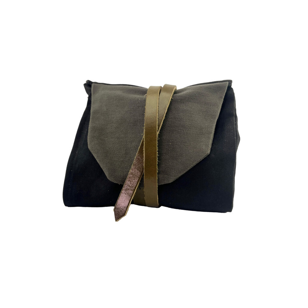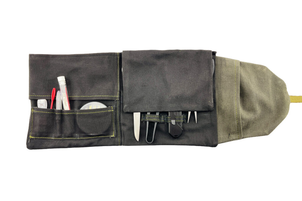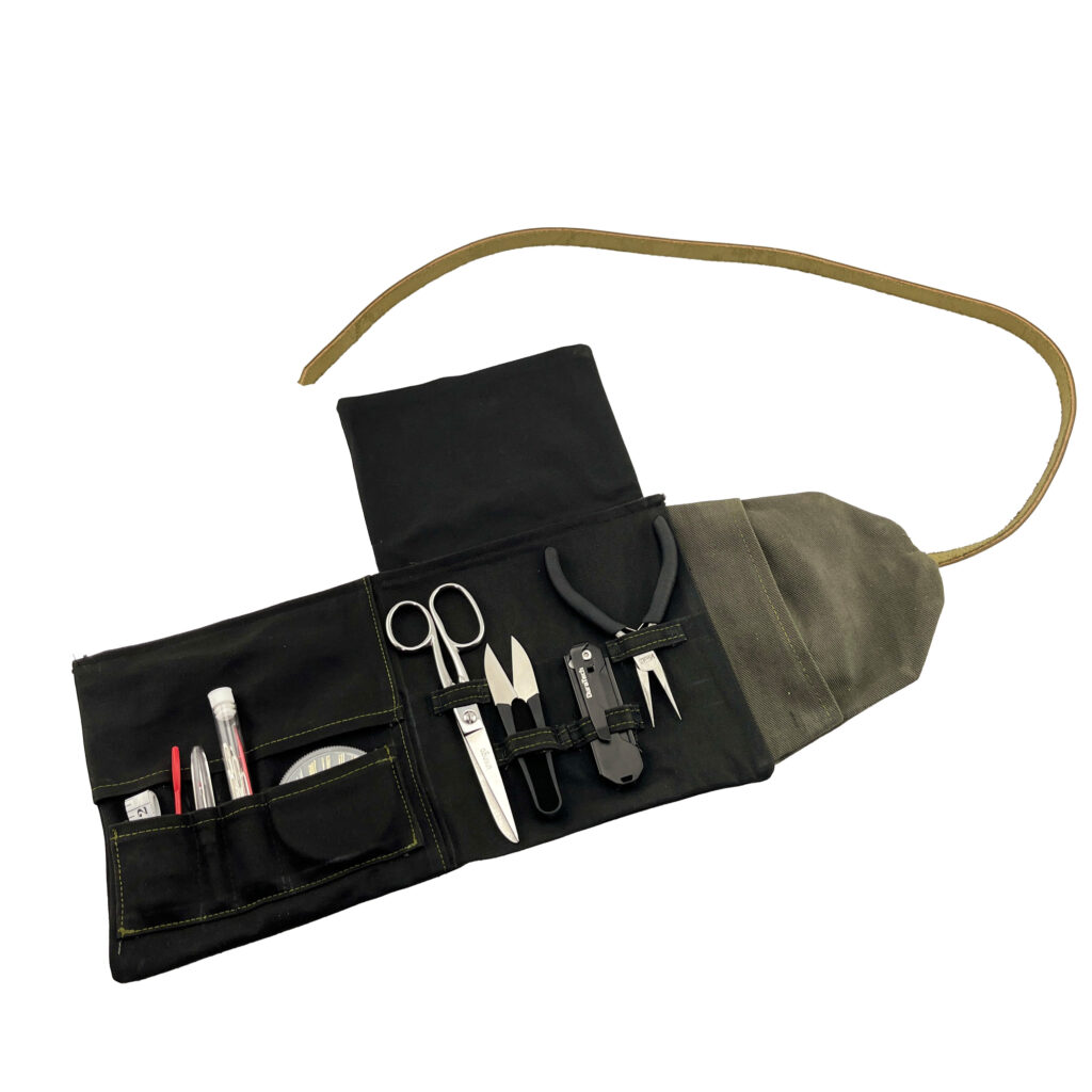 the materials are intentionally simple and sturdy — a canvas body that holds its shape on a table or countertop, paired with a leather strap that keeps everything neatly closed when stored. it’s made to live where you do your repairs: a desk, a workbench, the kitchen table. no frills, no gimmicks, just a dependable setup that’s always ready when you are.